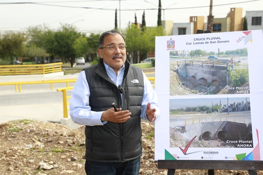 El Municipio de Escobedo concluyó la construcción de un puente pluvial en la Colonia Lomas de San Genaro, dando solución a una problemática de muchos años, ya que el paso elevado anterior era vulnerable a actos de vandalismo y derrumbes.